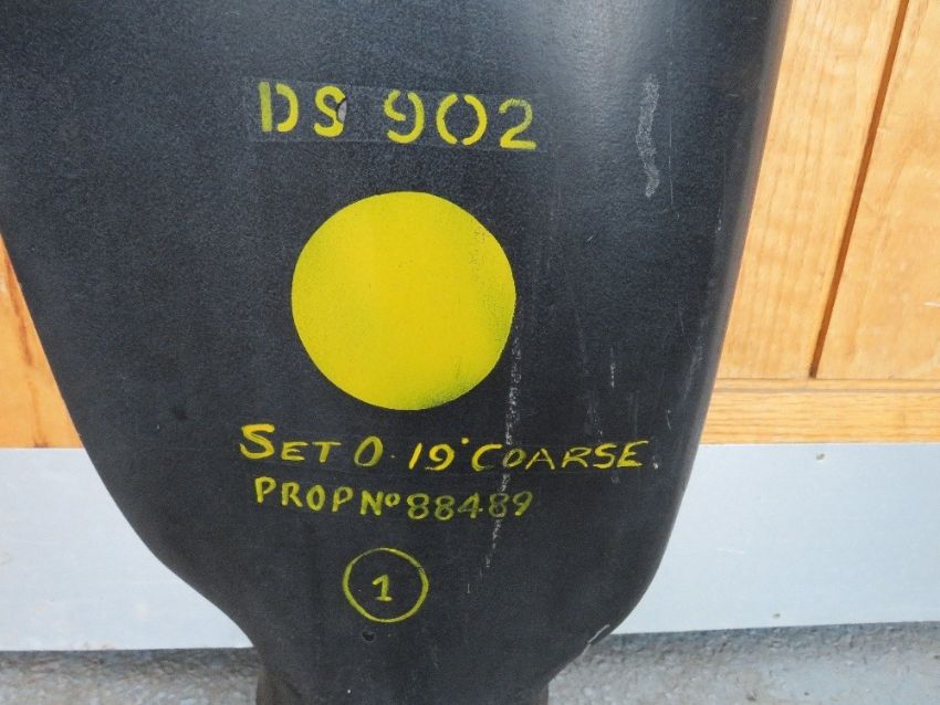A VINTAGE AVRO ANSON AIRCRAFT PROPELLER BLADE, black finish with yellow tip, marked 'DS 902' and various other serial numbers
