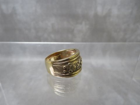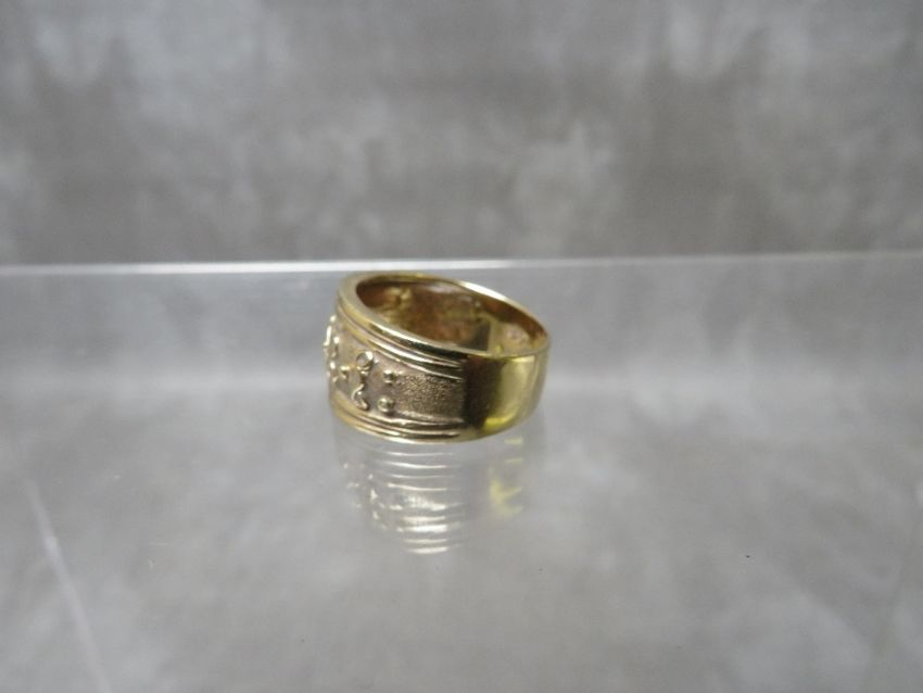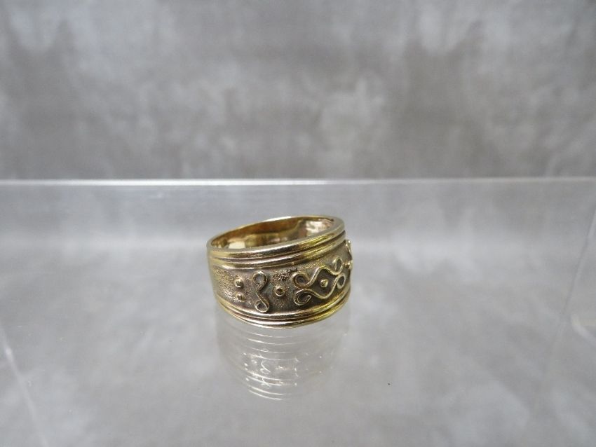 A HALLMARKED 9CT GOLD BAND PATTERNED RING, ring size T, approximate weight 7.6 g