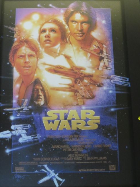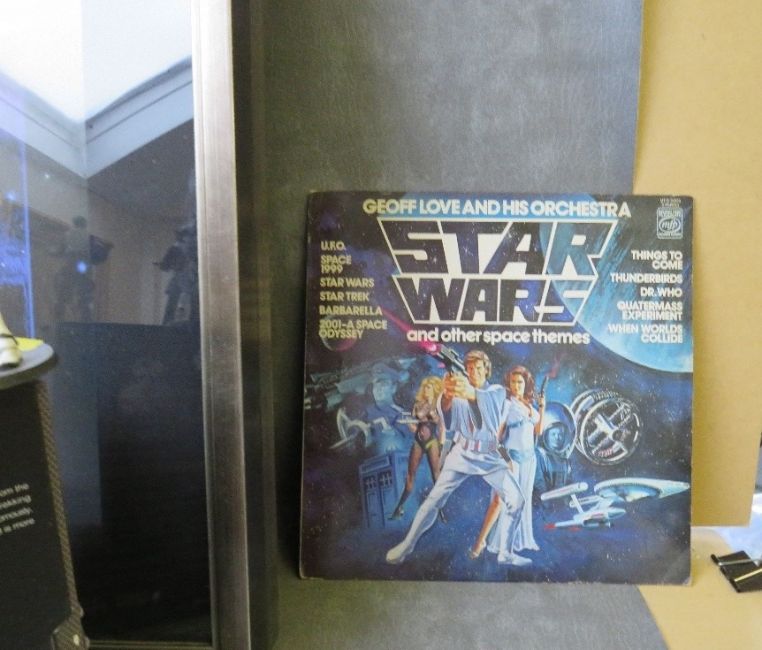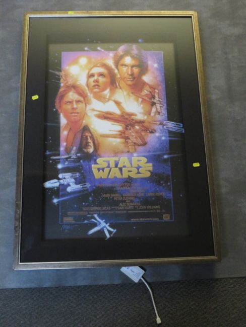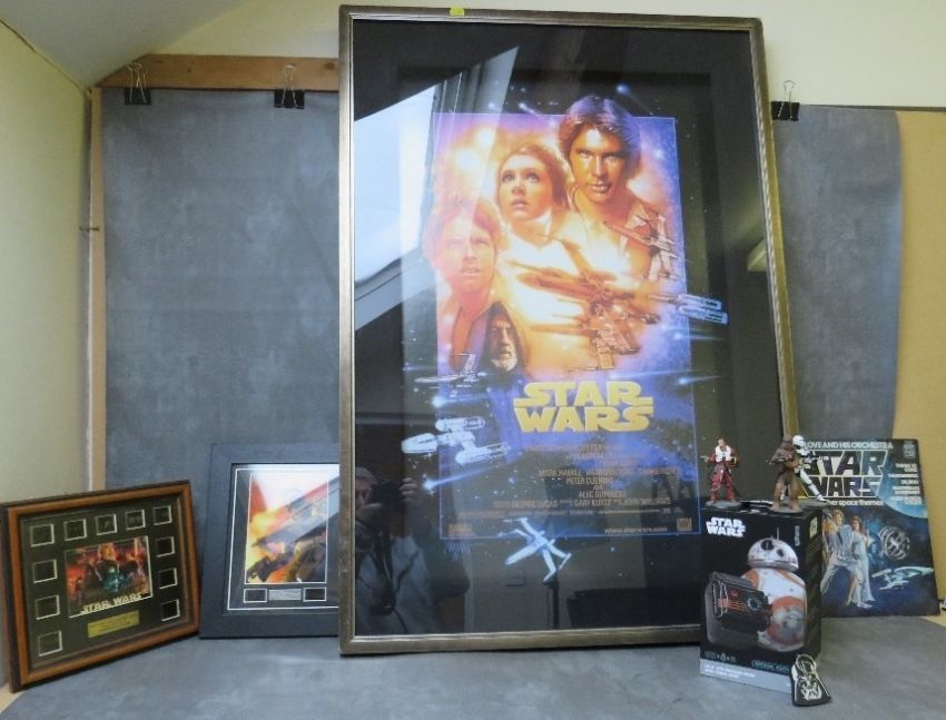 A MIXED STAR WARS LOT, to include a large illuminated sign, 104 x 73 cm, a boxed special edition BB8 app enabled droid, two framed film cell pictures - both having certificates of authenticity, three figures and a Geoff Love space themed LP record