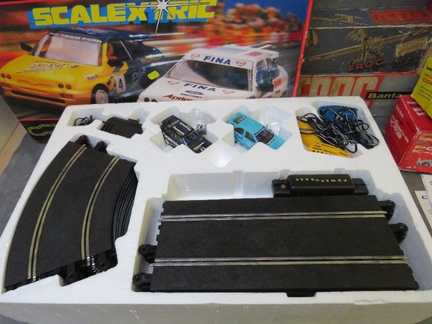 A MIXED BOXED TOY LOT, to include Scalextric Ford Escort rally set, two Radio Shack remote control cars (Corvette and Porsche K3), four vintage airplane model kits and a yacht kit (8)