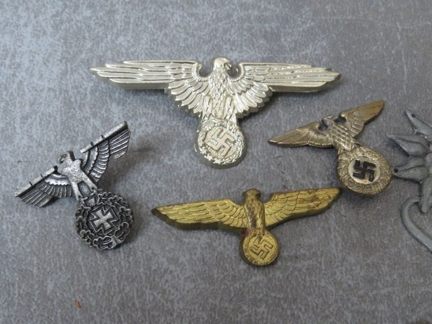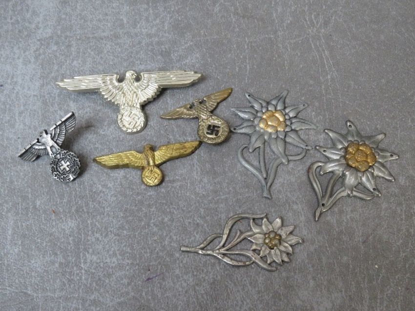 THIRD REICH WEHRMACHT - THREE EDELWEISS ALPINE CORPS CAP BADGES, together with three eagle and swastika badges plus one other