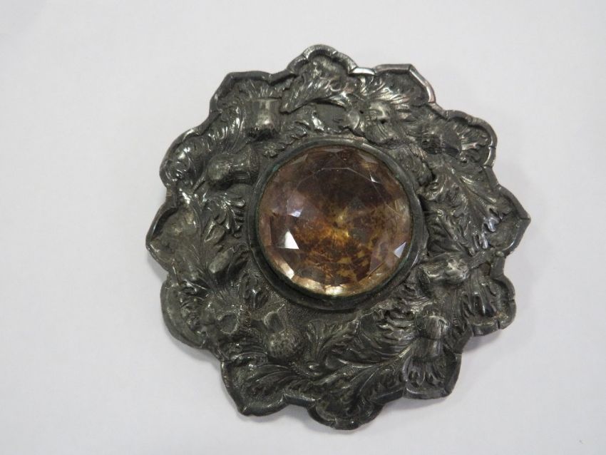 A large antique Scottish type white metal plaid brooch with thistle decoration and large central stone Dia. 9cm A/F