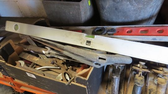 A large selection of hand tools together with a crop sprayer