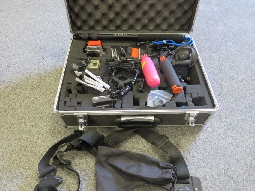 A cased Go Pro and accessories