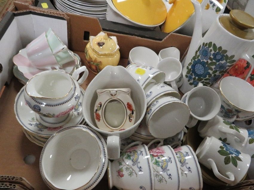 Two trays of assorted ceramics together with a tray of assorted vintage drinking glasses (2)