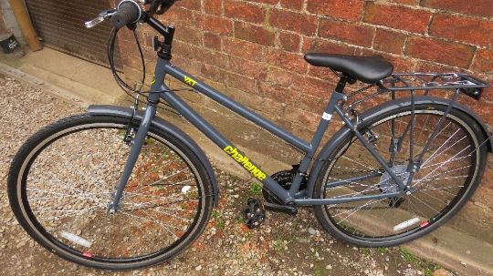 A grey Challenge VXT hybrid bike with steel frame, 18 speed, 28" wheels, 30-34 inside leg